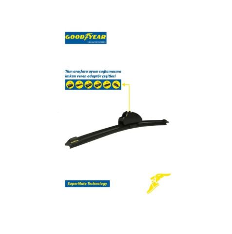 Paket içeriği: Orjinal Goodyear Super-Mute Ön cam için sağ ve sol muz tipi silecek süpürgesi seti ve bağlantı adaptörleri. (Pakete silecek kolu dahil değildir.)